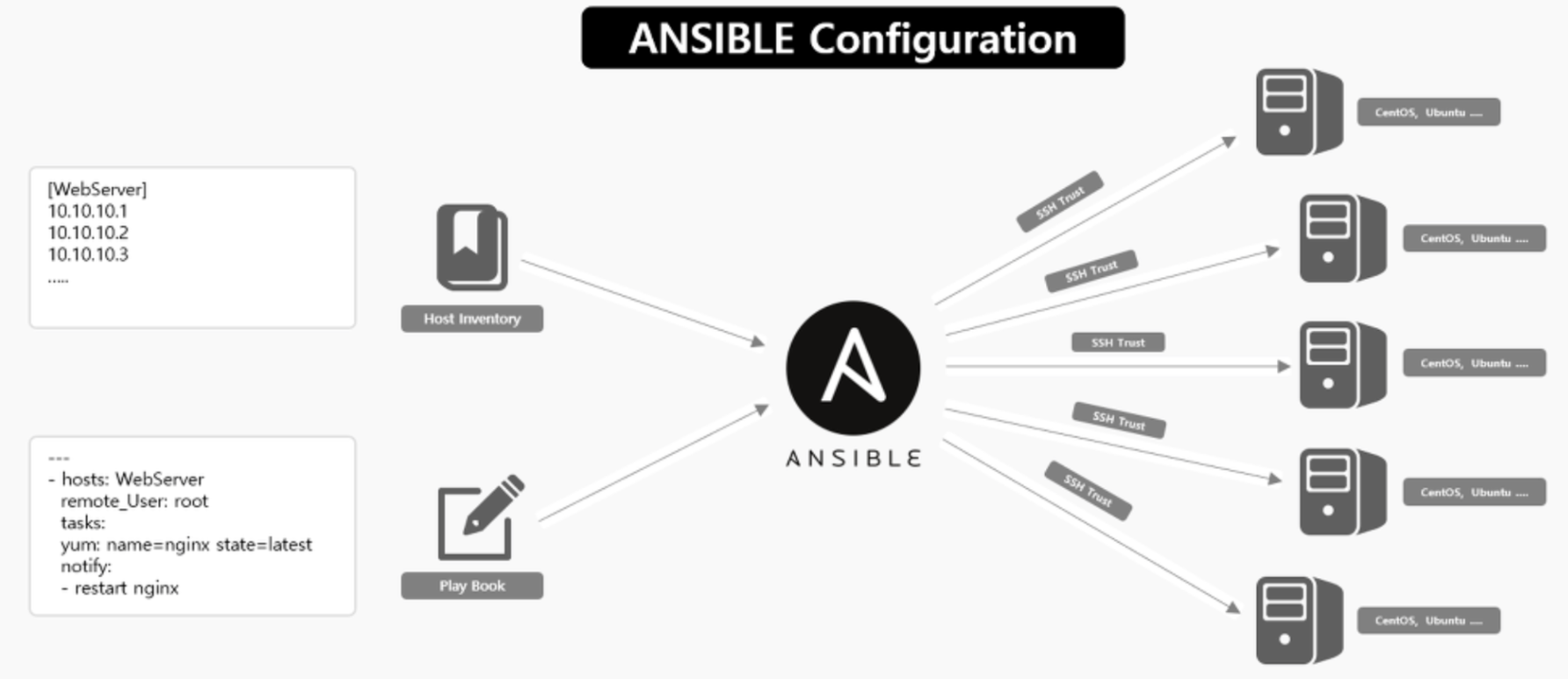- Ansible은 YAML로 관리되는 명령집을 여러번 수행하더라도 언제나 같은 결과가 나올 수 있도록 여러가지 관리를 한다.