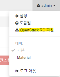 대쉬보드에서 관리자(admin) 계정으로 로그인 후 오른쪽 상단에 OpenStack RC File v3 클릭 후 다운로드
